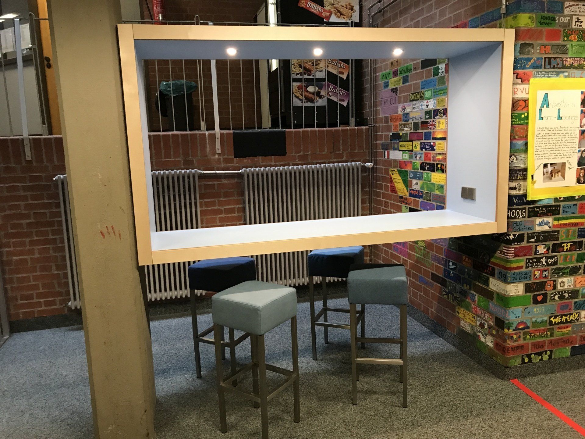 Fast ein Jahr hat es gedauert, von der Planung über den Modellbau und das Erproben eines Testmöbelstücks aus Pappe bis hin zur fertigen Lern- und Arbeitslounge, wie sie seit Ende der Faschingsferien nun im Untergeschoss der Altbauaula steht. Und das ist erst der Anfang ... Die Klasse 9e hat bereits im vergangenen Schuljahr gemeinsam mit Architektin Stephanie Reiterer verschiedene Möbel zur Umgestaltung der Aula entworfen und geplant. Stück für Stück werden diese nun in die Tat umgesetzt. Die so entstandene Lern- und Arbeitslounge kann ab sofort von den Schülern am Nachmittag genutzt werden, um dort zu lernen oder Referate in der Gruppe vorzubereiten. Aktuell läuft darüber hinaus eine Testphase, in der die Lounge auch für die Pausen als Speisebereich geöffnet ist.