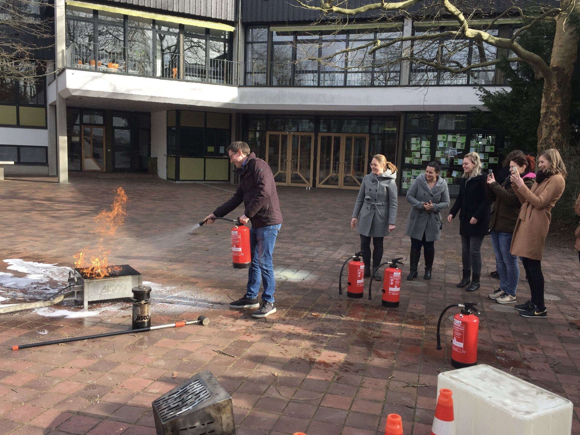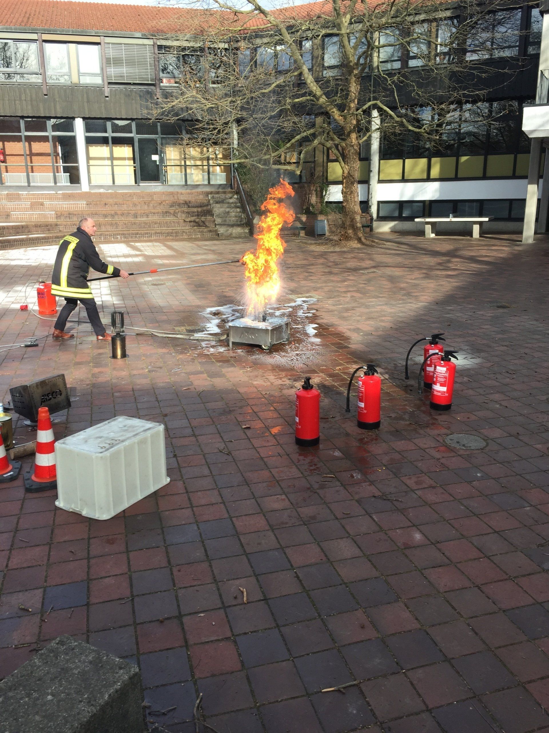 Am 20.02.2020 nahmen Lehrkräfte unserer Schule an einer Brandschutzhelferausbildung bei Herrn Schraufnagl von der Freiwilligen Feuerwehr Ismaning teil. Im theoretischen Teil ging es darum, den Respekt vor einem Feuer wieder herzustellen, der bei vielen Leuten durch einen langen, schadenfreien Zeitraum in der Regel leider verloren gegangen ist. So lernten die Lehrer die verschiedenen Brandklassen kennen, das richtige Verhalten in einem Brandfall und die korrekte Bedienung eines Feuerlöschers. Im praktischen Teil durfte jeder Teilnehmer mit einem Übungslöscher der Feuerwehr, gefüllt mit 9 Litern Wasser, einen simulierten Entstehungsbrand an einem Computerbildschirm löschen. Zum Schluss wurde eine beeindruckende Spraydosenzerknallung und eine Fettexplosion vorgeführt, wie sie häufig bei Küchenbränden entsteht. Vielen Dank an Herrn Schraufnagl für die spannende Fortbildung!