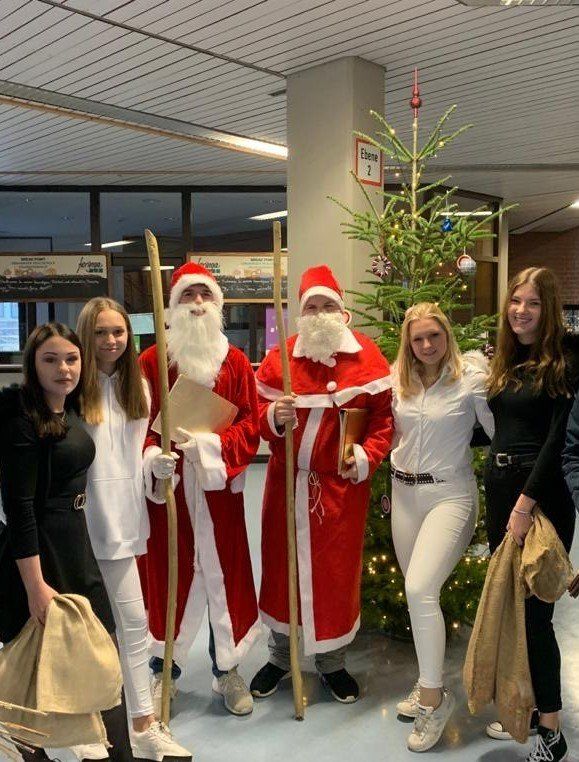 In das weihnachtliche Baumschmücken war dieses Jahr nicht nur die SMV involviert, sondern die gesamte Schulfamilie. Alle waren dazu eingeladen, Weihnachtsschmuck von zu Hause mitzubringen und an den Baum zu hängen. Allmählich füllte sich so der diesjährige Weihnachtsbaum der Realschule. Neben dem Adventskranz und weihnachtlichen Girlanden leuchtete der Baum heuer erstmals in der Altbauaula. Das lockte am Freitag, den 6. Dezember 2019, gleich zwei Nikoläuse mit ihren Engeln an. Sie statteten den Klassen einen Besuch ab, wobei es neben dem ein oder anderen Tadel für vergessene Hausaufgaben und Unordnung dennoch für alle Schokolade gab. Finanziell wurden die Nikoläuse vom Elternbeirat unterstützt. Auch der X-Mas-Day war ein beliebter Mottotag bei Lehrern und Schülern. Besonders bunte Söckchen mit Weihnachtsmotiven wurden an diesem Tag gerne getragen.