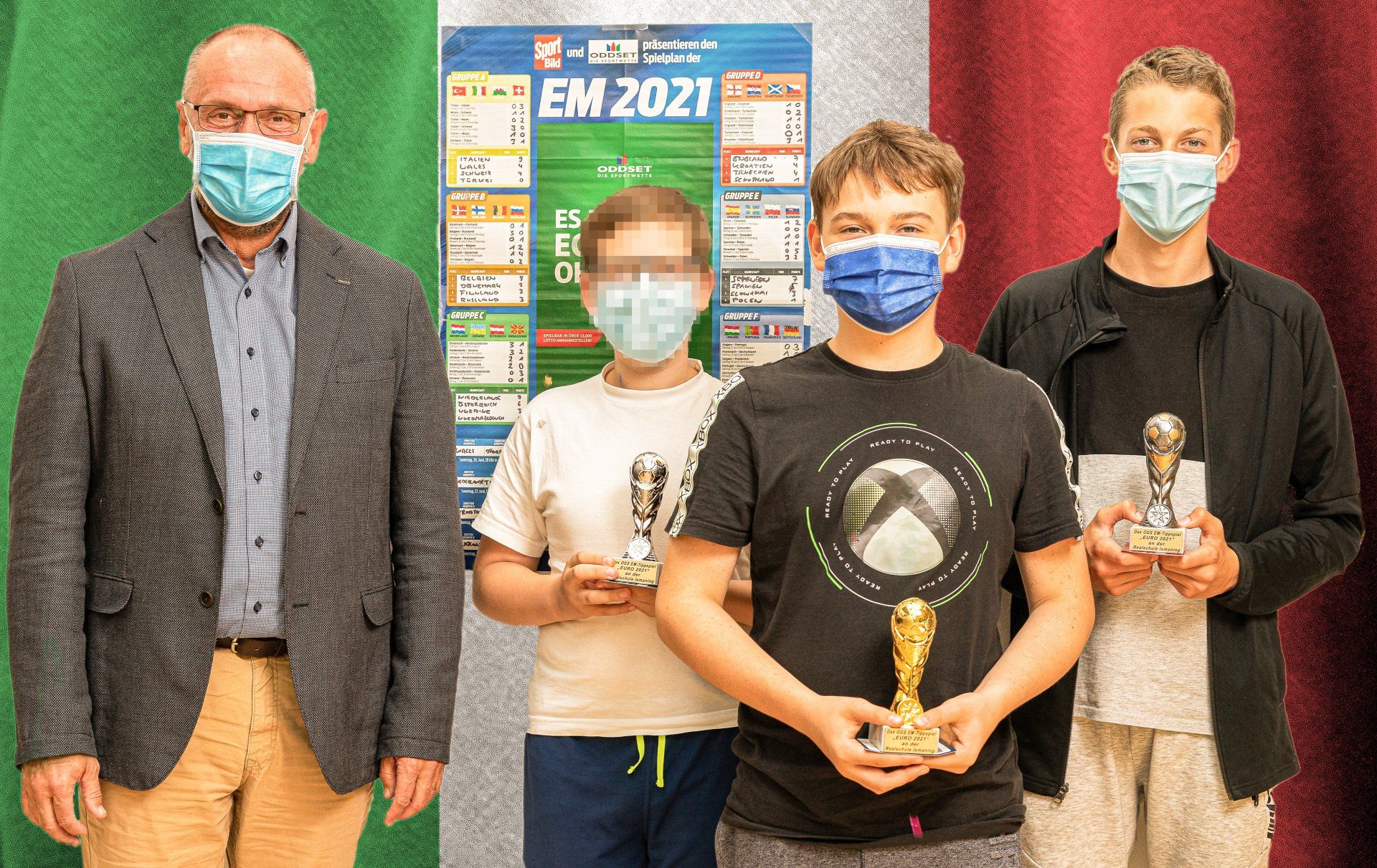 Im Juni und Juli 2021 schlugen die Herzen der Fußball-Fans wieder höher – denn die Endrunde der 16. Fußball-Europameisterschaft 2021 fand statt. Zwar schied die deutsche Mannschaft um Trainer Jogi Löw leider bereits im Achtelfinale aus – die Kinder aus der OGS hingegen waren bis zum Ende mit dabei. Sie nahmen nämlich am traditionellen Tippspiel der OGS teil. Jedes einzelne Spiel der Vorrunde und der Finalserie konnte von den Schüler*innen getippt werden. Eine besondere Herausforderung war dabei auch, sich bereits VOR der EM auf den späteren Europameister festzulegen. Die meisten Teilnehmer*innen waren sich einig, dass Weltmeister Frankreich auch den europäischen Thron besteigen würde – am Ende jubelten, wie wir alle wissen, aber die Italiener. Täglich wurden die Zwischenresultate und Tabellen studiert und ausgewertet – bis schließlich am 11. Juli der Pokal von Giorgio Chiellini die Höhe gehoben wurde. Und auch die vier Gewinner des Tippspiels (Florian, Tillmann, Adrian und Luka) durften jubeln – sie gewannen Pokale und „IS‘ GUT-Gutscheine."