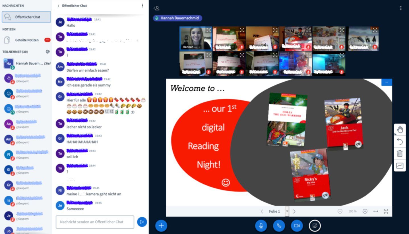Die Schüler*innen tauschten sich über ihre Lektüren aus und lasen sich gegenseitig und mit verteilten Rollen vor. Bis 21 Uhr wurde so von der Couch oder der gemütlichen Kuschelecke aus gelesen, gelacht, gesnackt und ganz nebenbei auch ein bisschen was gelernt. Klar wäre es schöner gewesen, sich mal wieder "live" zu sehen, aber so verbrachte man irgendwie doch mal wieder einen schönen, gemeinsamen Abend!